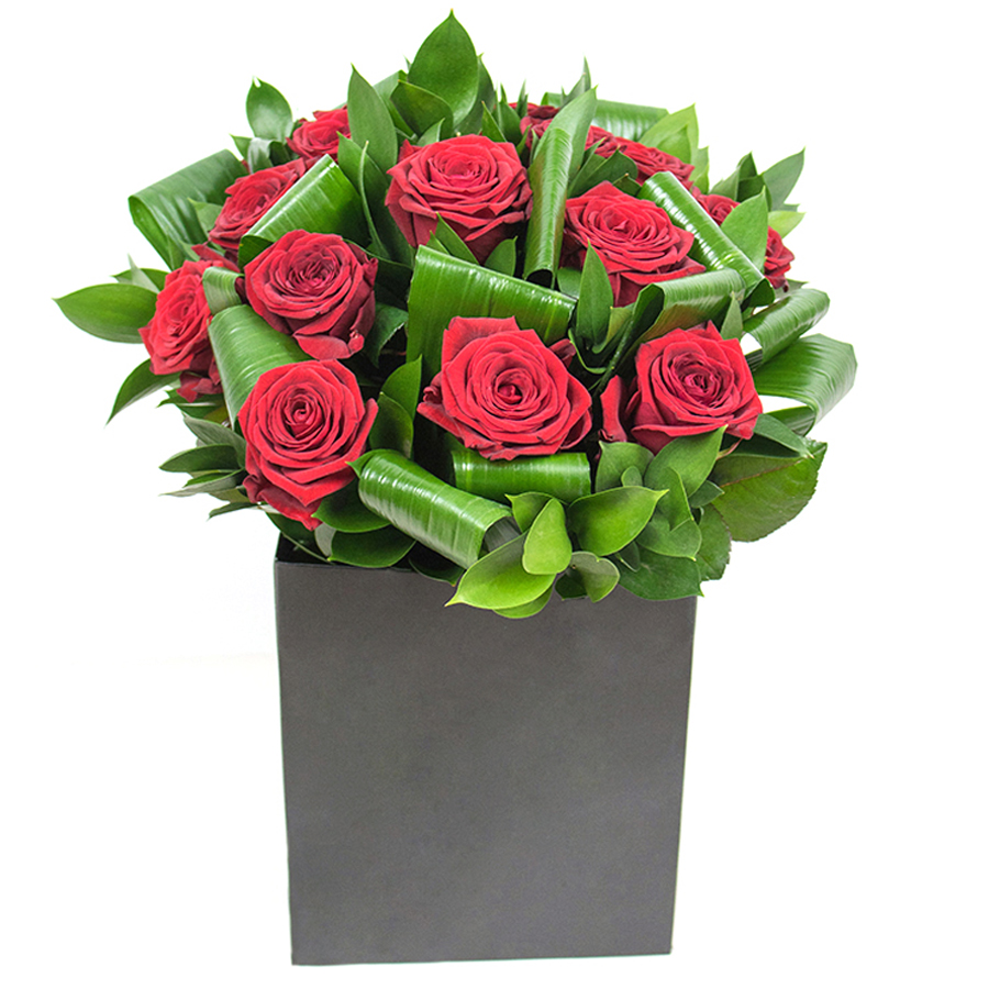 Celebrate beauty with our elegant bouquet, featuring lush red roses, vibrant aspidistra leaves, and elegant ruscus. Each flower is hand-selected for utmost freshness and quality, ensuring a luxurious display.